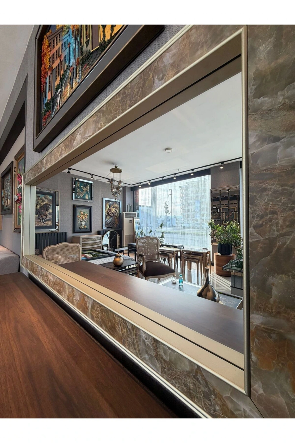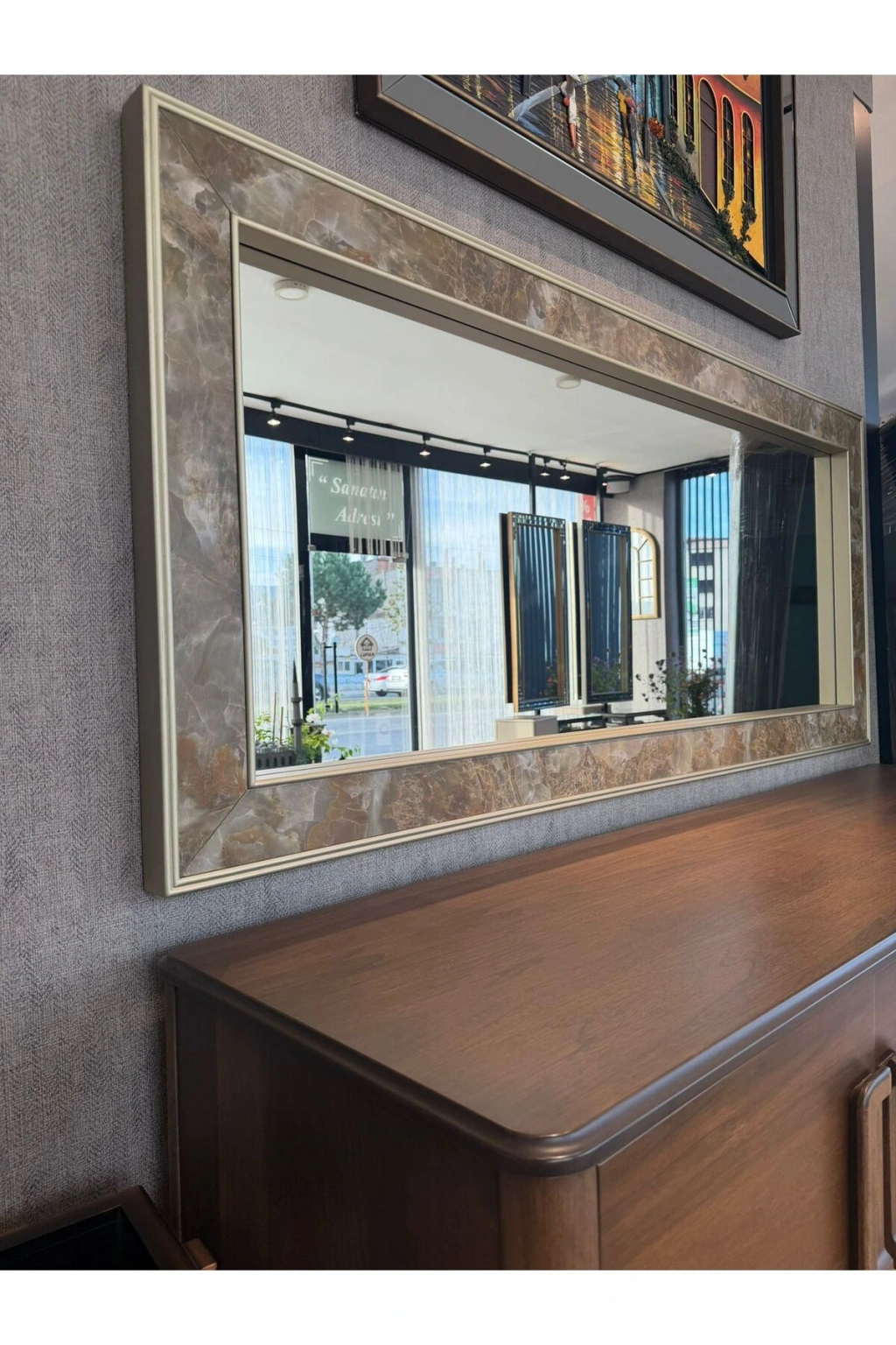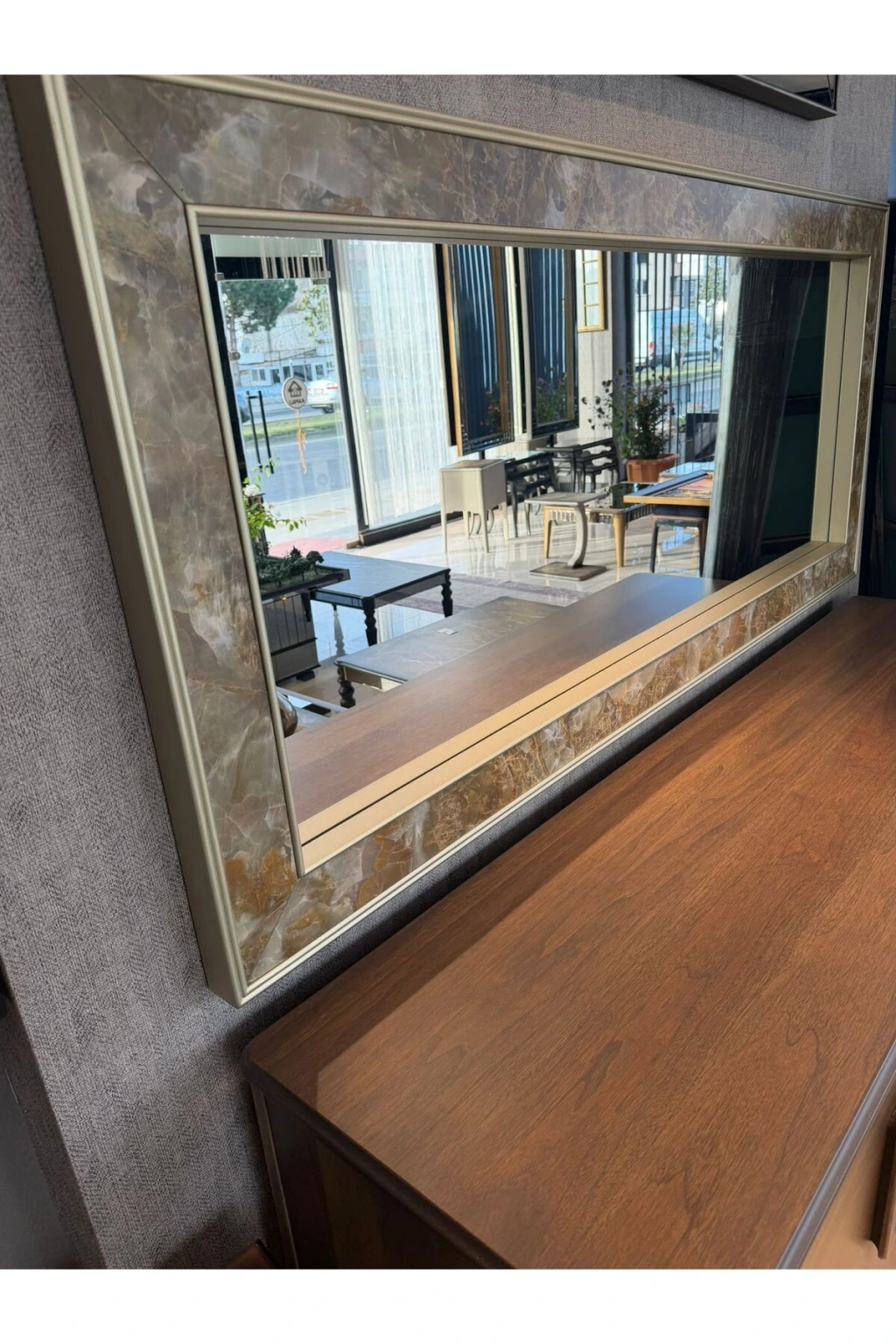 - Türkiye menşeli, yerli üretim garantisiyle sunulan bu duvar aynası, kaliteli malzemeler kullanılarak özenle üretilmiştir.; - Dikdörtgen şekliyle modern ve şık bir görünüm kazandırarak mekanlarınıza estetik bir dokunuş ekler.; - Ahşap materyali ile dayanıklılık ve uzun ömürlü kullanım sunar; aynı zamanda doğal bir sıcaklık hissiyatı yaratır.; - Duvar aynası kategorisinde yer alan bu ürün, oturma odanızdan yatak odanıza kadar her alanda dekoratif bir aksesuar olarak tercih edilebilir.; Sanatsal boya ve el işçiliği ile üretilen özel aynamızdır.; Evinizin neresine koyarsanız koyun yakışıcak bir tasarım.; Mermer dokulu bu özel ayna; salon, giriş, yemek alanı ve yatak odasına anında şıklık ve derinlik katar.;